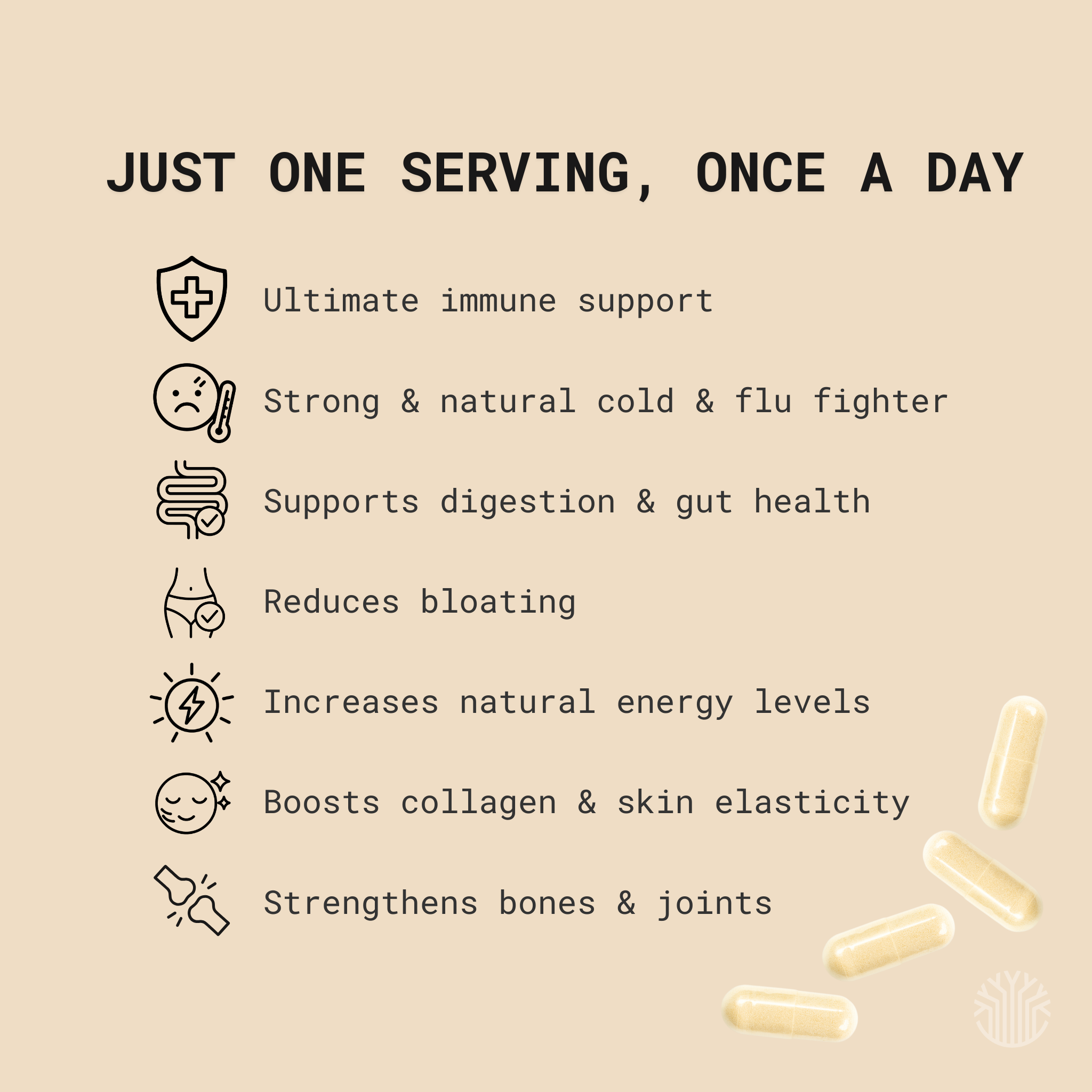 - High in Vitamin C: Each capsule contains a significant amount of vitamin C, which supports immune function and helps protect against illnesses.